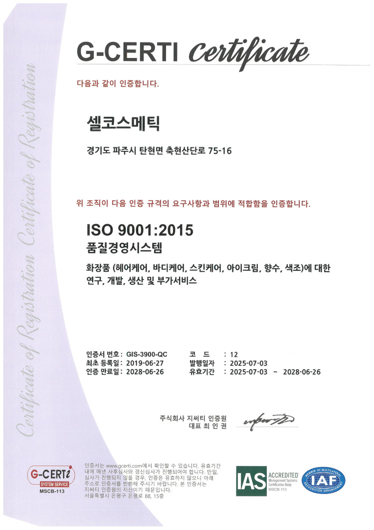 (2025)ISO 9001 페이지 정보 작성자 관리자 작성일25-12-26 12:17 댓글0건 관련링크 이전글 다음글 목록 본문 화장품 (헤어케어, 바디케어, 스킨케어, 아이크림, 향수, 색조)에 대한 연구, 개발, 생산 및 부가서비스 댓글목록 등록된 댓글이 없습니다. 이전글 다음글 목록